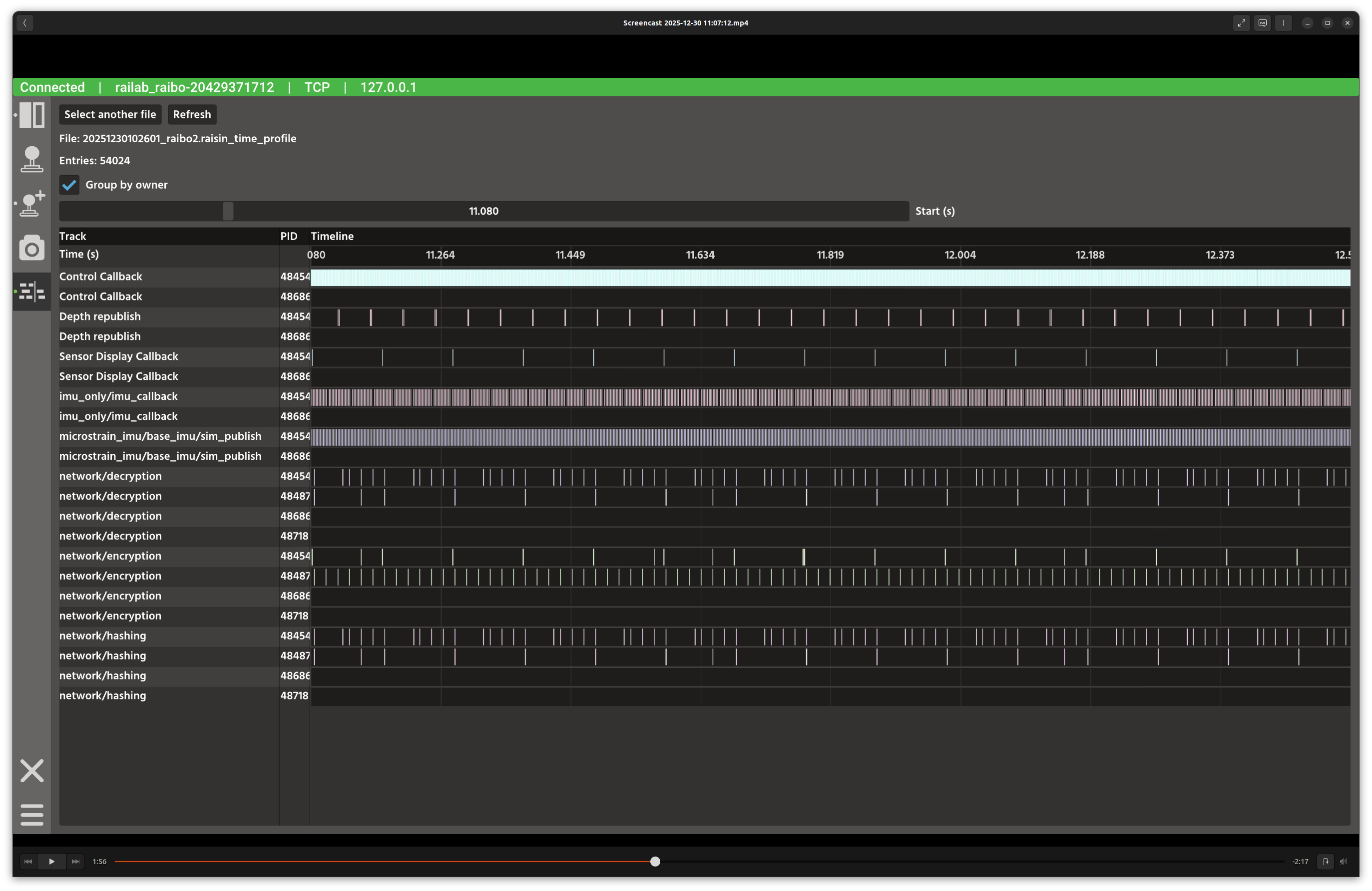 In the screenshot above, the left column lists recorded time profile files, and the right panel shows a scrollable timeline of execution spans. Each row represents a function (optionally grouped by owner) and uses color to distinguish tracks.
